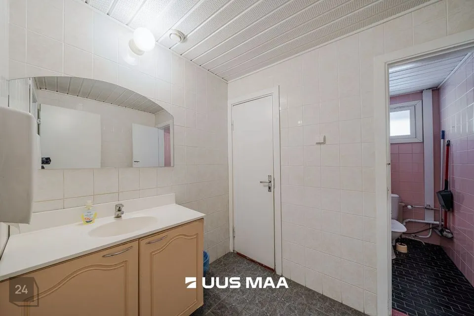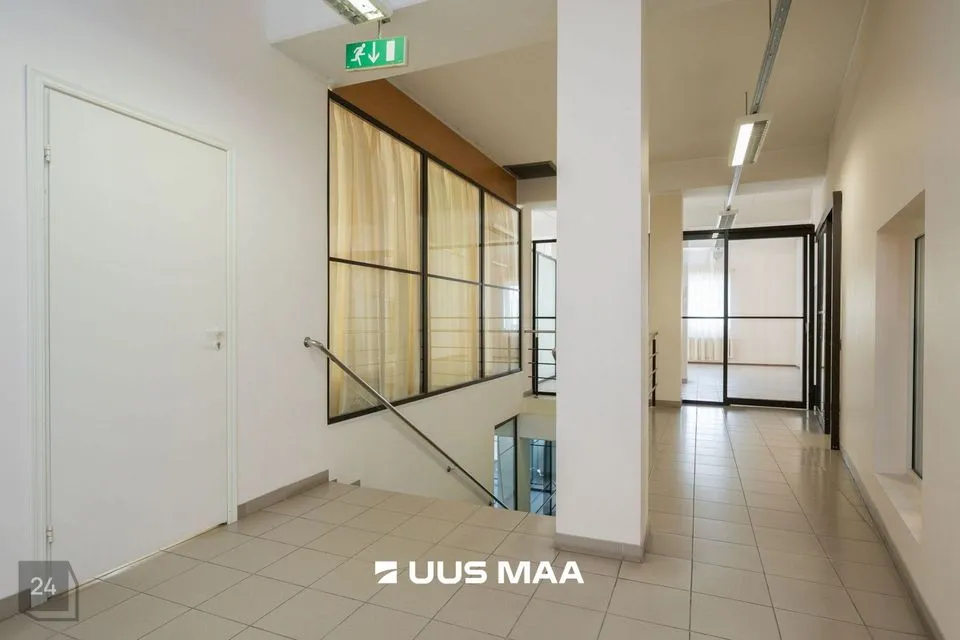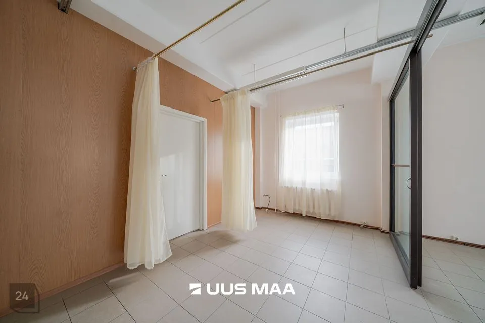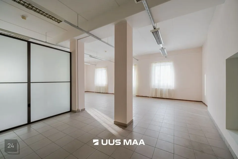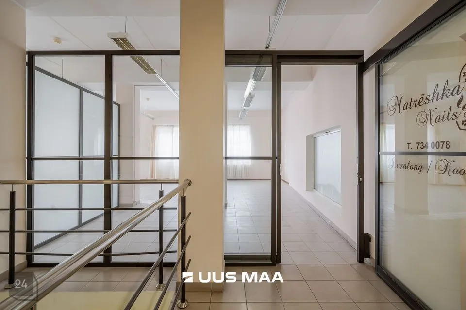 Tegemist on 75m² avarate ruumidega teisel korrusel, millel on klaasidega uksed, aknad kahes suunas ning rõdu maja ette parkla suunas. Varasemalt on antud pinnal tegutsenud ilutoodete müügisalong. Ruumidesse kuuluvad klaasseintega eraldatud suur saal ja väiksem saal, kus on olemas vee valmidus. Need ruumid on sobilikud mitmesugusteks teenindus- või bürooruumideks, ilusalongiks või kaubanduspinnaks. Tualettruum asub koridoris.