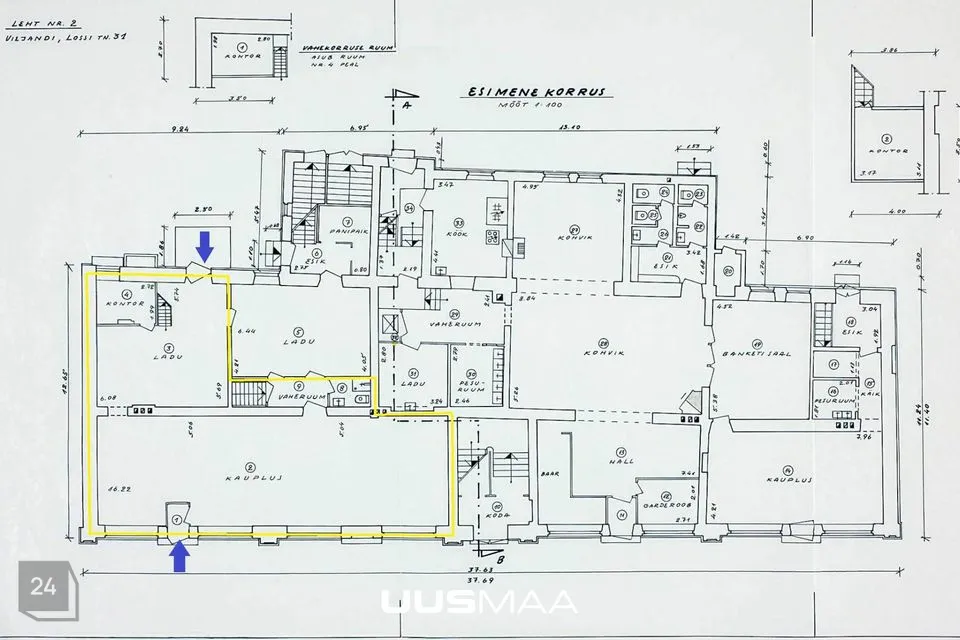 1. avarast vitriinakendega tänavapoolsest kõrge laega ruumist (varasemalt olnud kasutusel müügisaalina - lae kõrgus 3,44m, ruumi mõõdud 5,05mx16,16m)