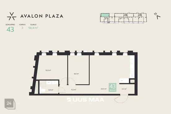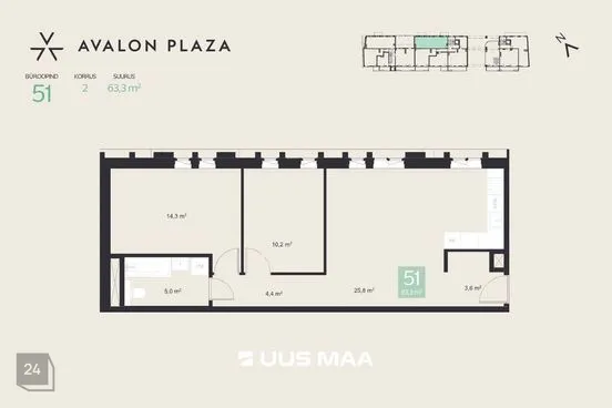 Avalon Plaza äripind nr 51 on avara planeeringuga 3-toaline apartement hoone 2. korrusel. Valmis üleandmiseks 2025. aasta lõpus!