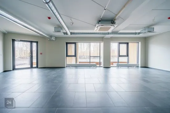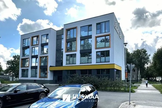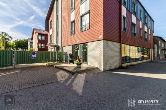 Osaliselt rentnikega kaetud ärihoone.