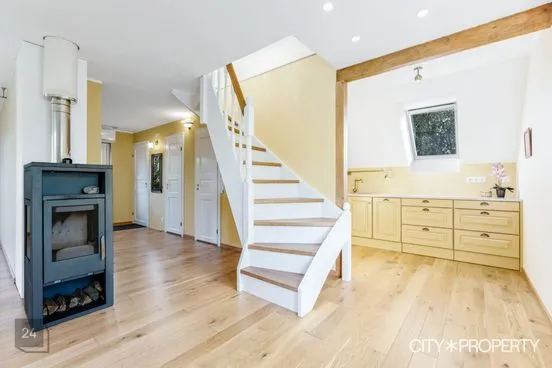Dwelling total net area is 129.2 m2.On the first floor, there is a spacious and light-filled 18.2 m2 living room, 13.9 m2 dining room, 11.2 m2 kitchen, 6.6 m2 windbreak/entryway, wardrobe, and a 1.7 m2 bathroom/WC. A solid wooden staircase leads to the second floor, where there