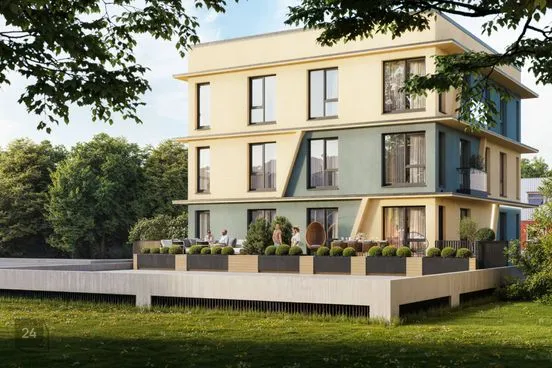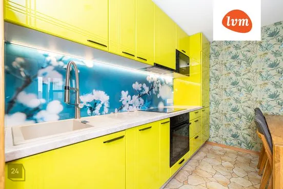 The apartment starts with a wide hallway with a spacious built-in wardrobe.The living room with an open-plan kitchen is logically and functionally divided into a lounge