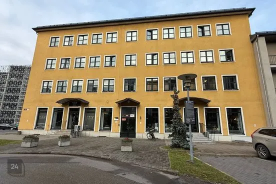 Osaliselt rentnikega kaetud ärihoone.