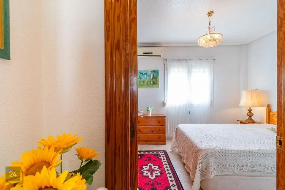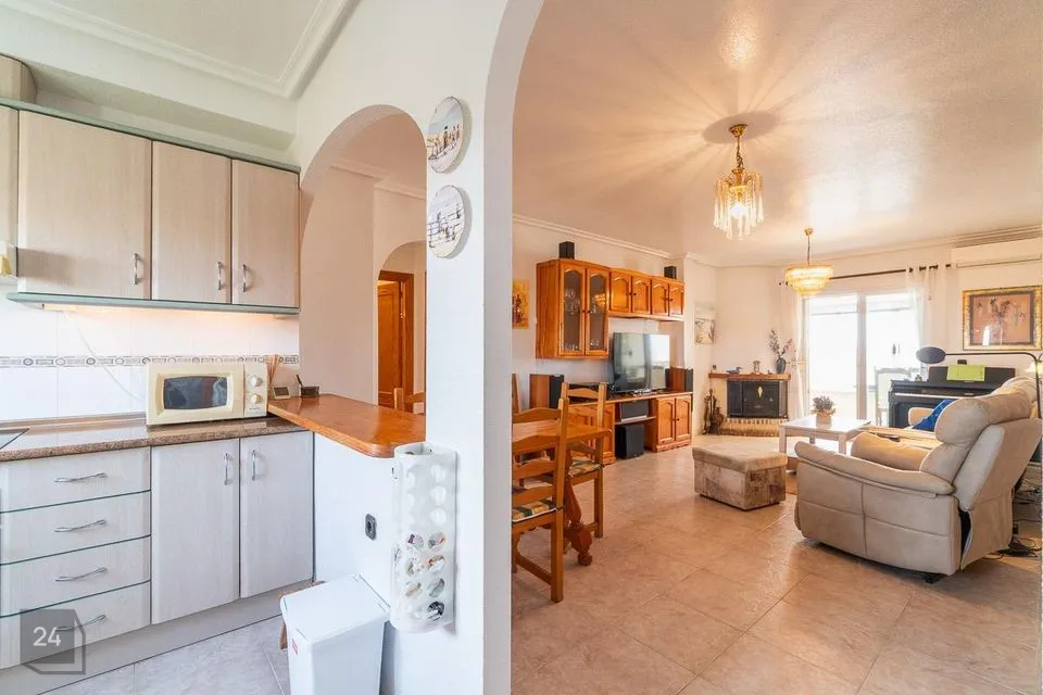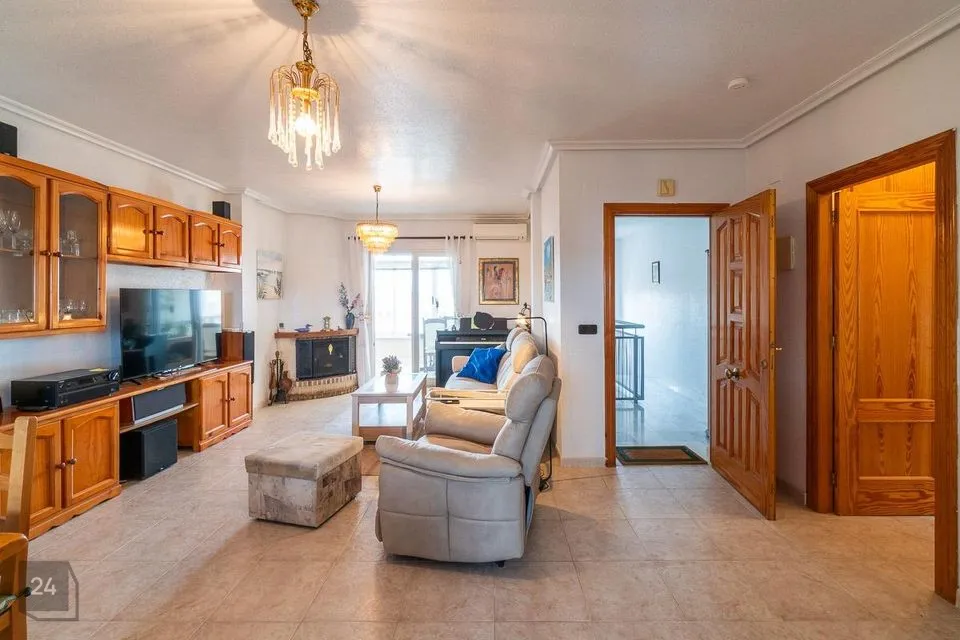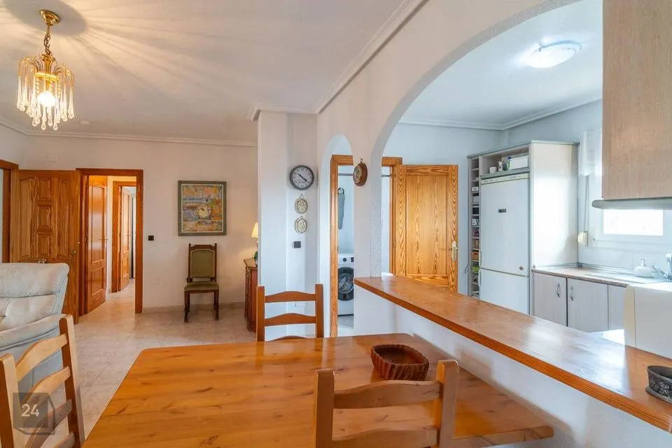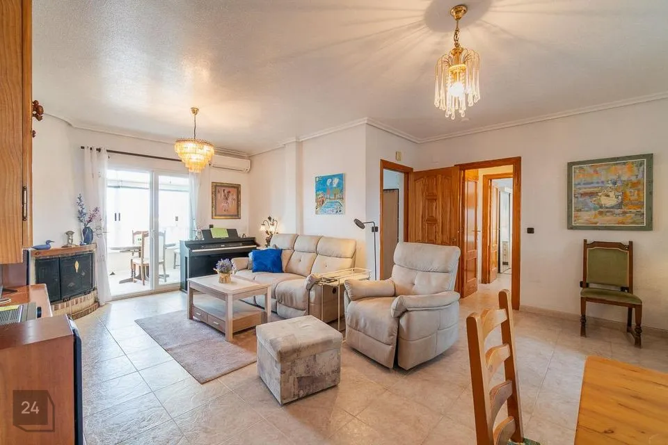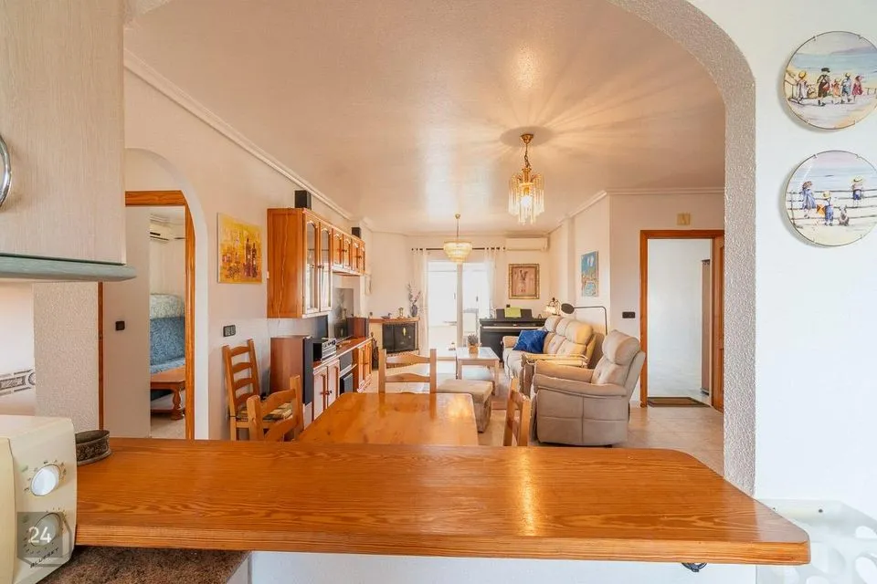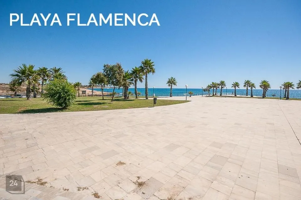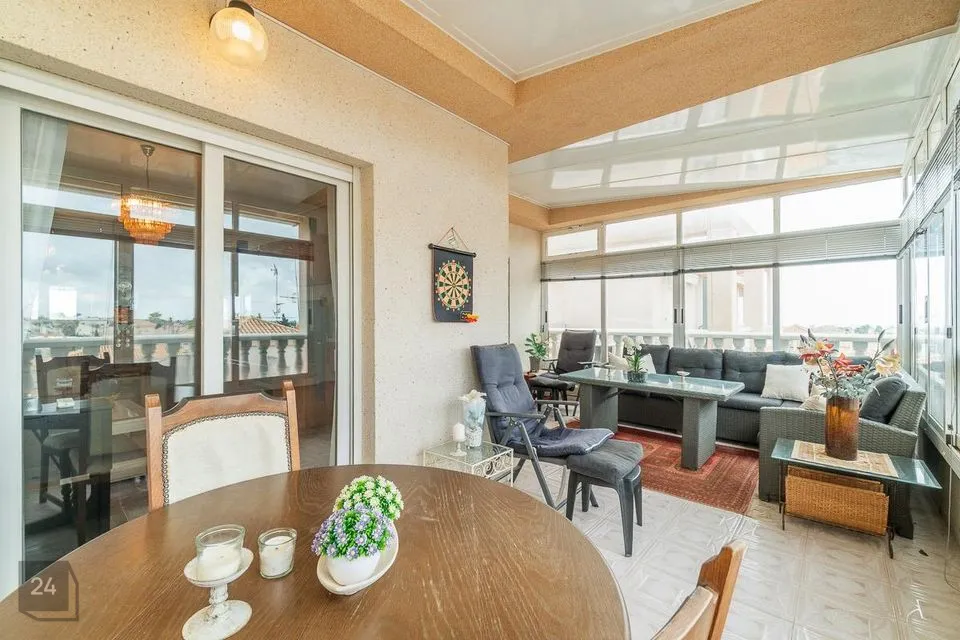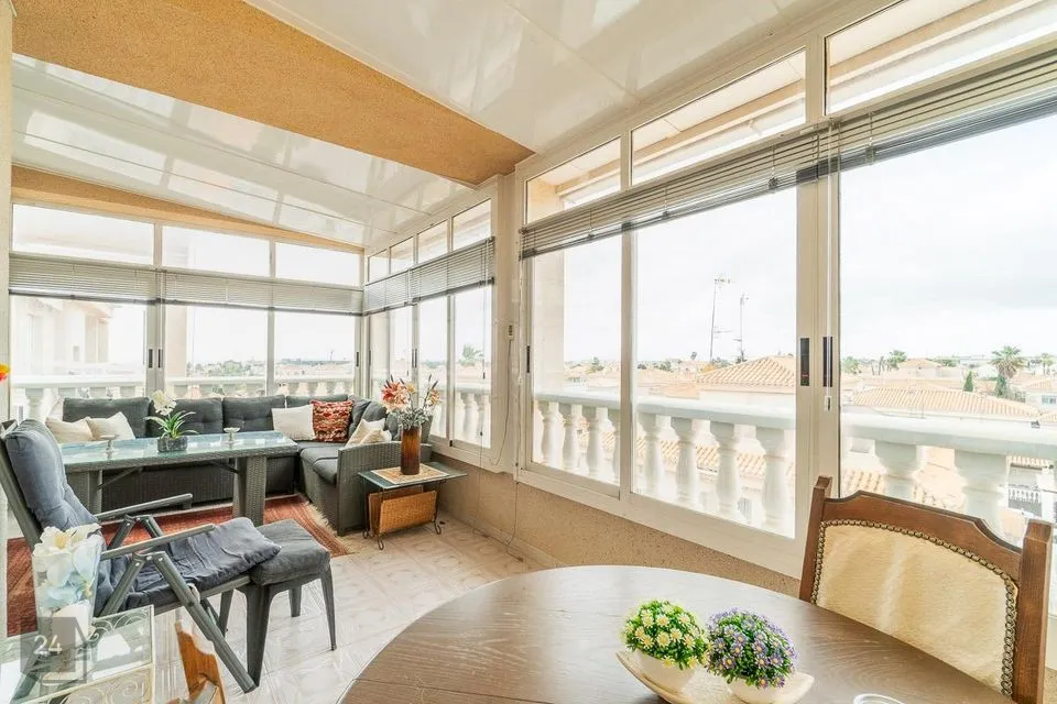 Beautiful, spacious and bright penthouse with excellent views in the heart of Playa Flamenca, where in addition to the sunshine all day long, you and your family can count on more than 120 m2 of surface, a double garage for cars and a storage room. ~~The area of Playa Flamenca where it is located is ideal as it is within walking distance of the Zenia Boulevard shopping center, the city's sports fields, schools, shops, leisure centers and of course 10 minutes from the best beaches of Orihuela Costa. ~~The residential is fenced and has automatic gates for vehicle access and there is a parking lot where you can leave your car on the street, an Olympic-sized swimming pool, 25x12 plus gardens all around and plenty of parking spaces for vehicles. ~~The property is very spacious and open, the main aluminum and glass fence faces south and the sunshine shines practically all day, so in winter it can be closed and maintain the temperature and heat the entire house with the warmth of the aluminum railing, but also thanks to the windows on both sides of the house, it can be opened and it gives a breeze that... refreshes the atmosphere in the hot months and opening the windows to the garden makes the house well ventilated and cool. All the windows give a feeling of independence and privacy, as it is the tallest house in the area and is not overlooked by any other property.~~The penthouse is of a very good size, practically 120 m2, with a beautiful living-dining room with a fireplace, a spacious kitchen with a breakfast bar and a pantry-laundry room, three large bedrooms with built-in wardrobes, the master bedroom has an en suite bathroom and a second full bathroom for the rest of the apartment. Everywhere you look, there is a feeling of spaciousness and roominess.~~In addition to the street parking next to the property, where you can temporarily leave your vehicle to take your shopping and go straight to the property, it also has its own closed garage with an automatic communal door and a lockable private door, where you can leave your vehicle or bicycles permanently or use it as a safe and convenient storage space.~~The house has underfloor heating, is furnished, in perfect condition and ready to move into immediately.~~The property is worth visiting to see and enjoy all its advantages.