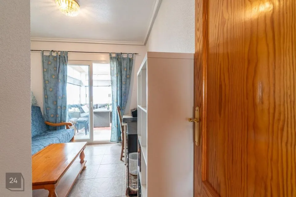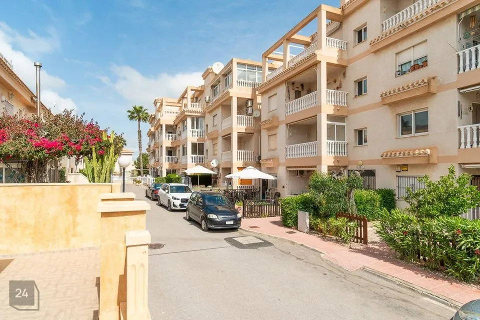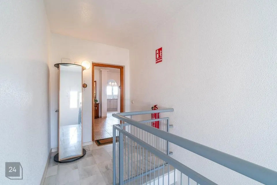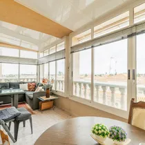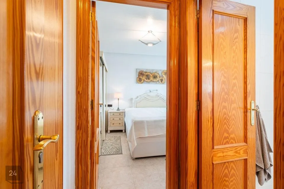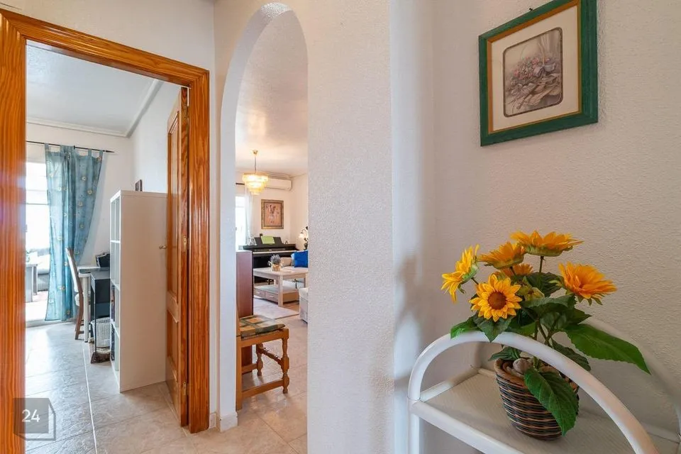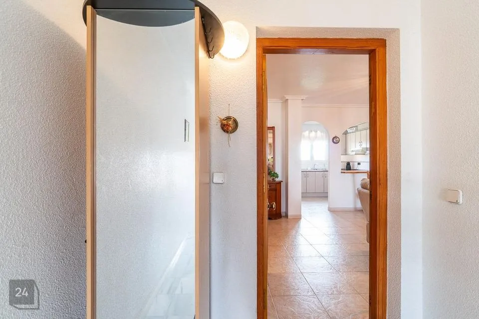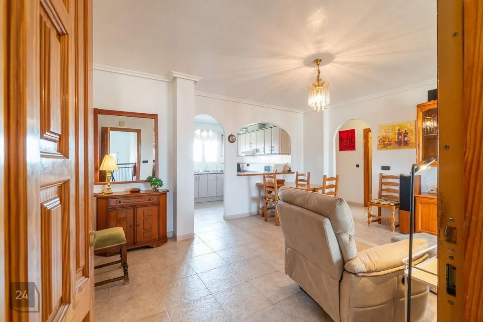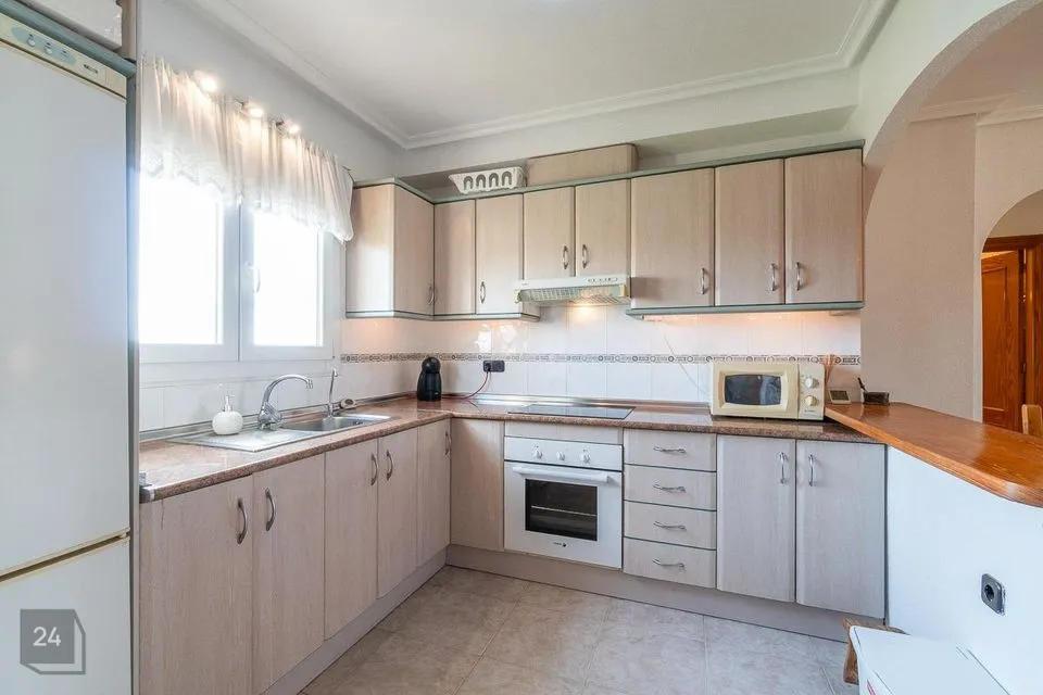 Beautiful, spacious and bright penthouse with excellent views in the heart of Playa Flamenca, where in addition to the sunshine all day long, you and your family can count on more than 120 m2 of surface, a double garage for cars and a storage room. ~~The area of Playa Flamenca where it is located is ideal as it is within walking distance of the Zenia Boulevard shopping center, the city's sports fields, schools, shops, leisure centers and of course 10 minutes from the best beaches of Orihuela Costa. ~~The residential is fenced and has automatic gates for vehicle access and there is a parking lot where you can leave your car on the street, an Olympic-sized swimming pool, 25x12 plus gardens all around and plenty of parking spaces for vehicles. ~~The property is very spacious and open, the main aluminum and glass fence faces south and the sunshine shines practically all day, so in winter it can be closed and maintain the temperature and heat the entire house with the warmth of the aluminum railing, but also thanks to the windows on both sides of the house, it can be opened and it gives a breeze that... refreshes the atmosphere in the hot months and opening the windows to the garden makes the house well ventilated and cool. All the windows give a feeling of independence and privacy, as it is the tallest house in the area and is not overlooked by any other property.~~The penthouse is of a very good size, practically 120 m2, with a beautiful living-dining room with a fireplace, a spacious kitchen with a breakfast bar and a pantry-laundry room, three large bedrooms with built-in wardrobes, the master bedroom has an en suite bathroom and a second full bathroom for the rest of the apartment. Everywhere you look, there is a feeling of spaciousness and roominess.~~In addition to the street parking next to the property, where you can temporarily leave your vehicle to take your shopping and go straight to the property, it also has its own closed garage with an automatic communal door and a lockable private door, where you can leave your vehicle or bicycles permanently or use it as a safe and convenient storage space.~~The house has underfloor heating, is furnished, in perfect condition and ready to move into immediately.~~The property is worth visiting to see and enjoy all its advantages.