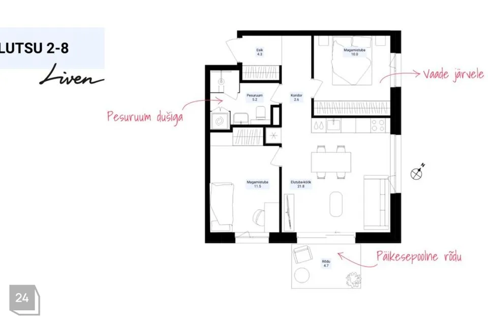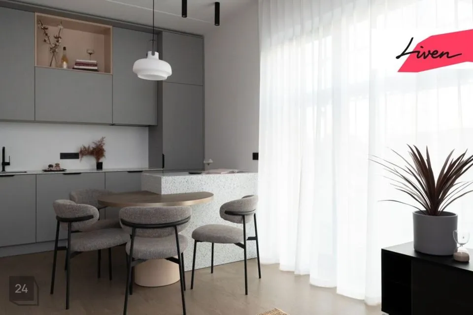 Iseära homes have 2.8-metre-high ceilings, as well as 2.4-metre floor-to-ceiling windows. Each home has a balcony or a terrace that is accessible through a space-saving sliding door. Geothermal heating system and solar panels installed on the roof keep the utility costs low and ensure the building's A-energy class. Iseära homes offer several layout options. For more information, visit the website https://liven.ee/home/iseara/kortermajad/ or come and visit us at our office.