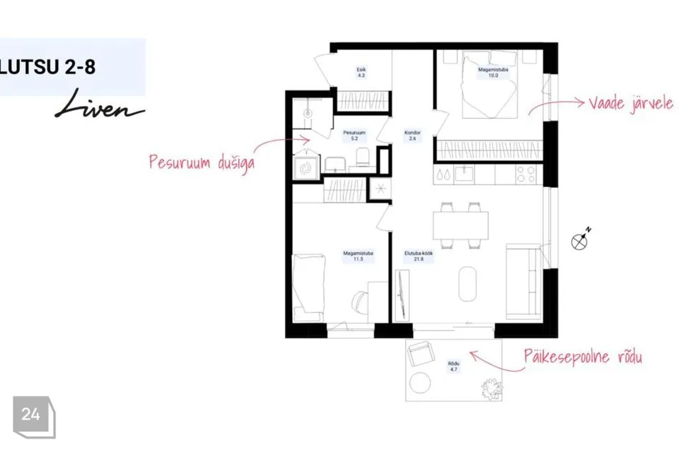 Iseära homes have 2.8-metre-high ceilings, as well as 2.4-metre floor-to-ceiling windows. Each home has a balcony or a terrace that is accessible through a space-saving sliding door. Geothermal heating system and solar panels installed on the roof keep the utility costs low and ensure the building's A-energy class. Iseära homes offer several layout options. For more information, visit the website https://liven.ee/home/iseara/kortermajad/ or come and visit us at our office.