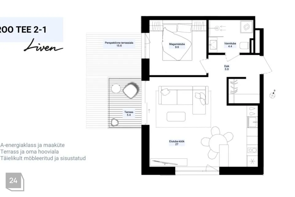 Iseära homes have 2.8-metre-high ceilings, as well as 2.4-metre floor-to-ceiling windows. Each home has a balcony or a terrace that is accessible through a space-saving sliding door. Geothermal heating system and solar panels installed on the roof keep the utility costs low and ensure the building's A-energy class. Iseära homes offer several layout options. For more information, visit the website https://liven.ee/home/iseara/kortermajad/ or come and visit us at our office.