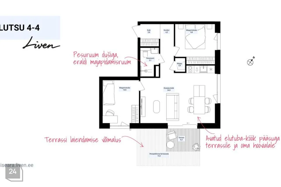 Iseära homes have 2.8-metre-high ceilings, as well as 2.4-metre floor-to-ceiling windows. Each home has a balcony or a terrace that is accessible through a space-saving sliding door. Geothermal heating system and solar panels installed on the roof keep the utility costs low and ensure the building's A-energy class. Iseära homes offer several layout options. For more information, visit the website https://liven.ee/home/iseara/kortermajad/ or come and visit us at our office.