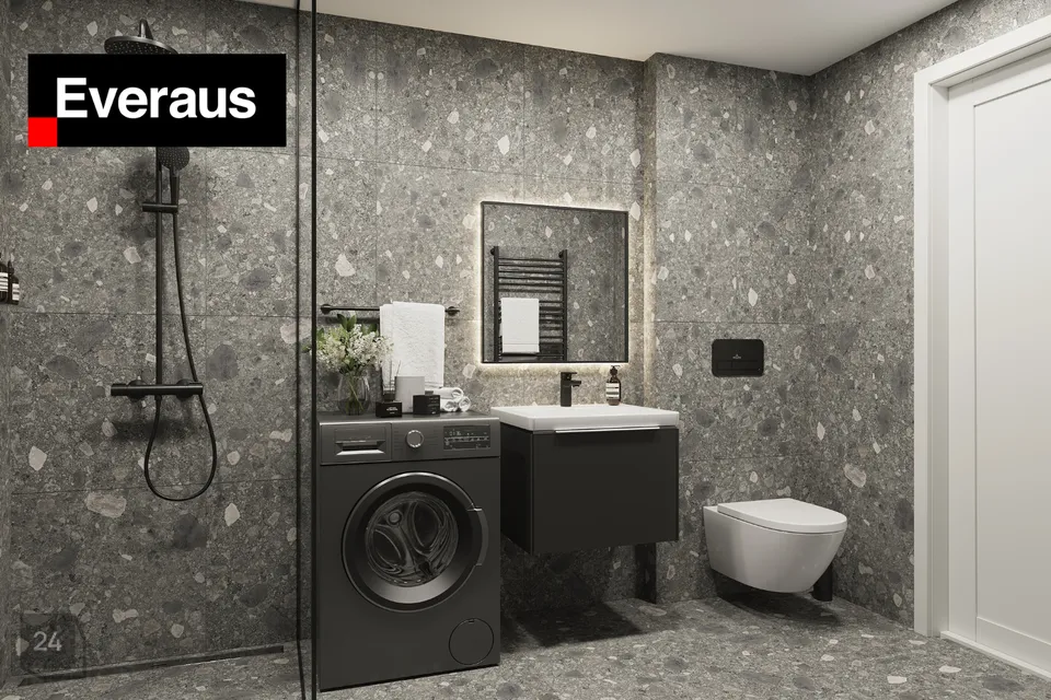 The three-story buildings with an A energy rating (calculated energy efficiency) comprise a total of eight apartments. Ground-floor homes feature large terraces and private yard areas, while second- and third-floor apartments include balconies. Eco-friendly solutions like geothermal heating and apartment-specific ventilation with heat recovery help reduce environmental impact, lower heating costs, and improve living quality. Each apartment comes with an individual energy consumption meter.