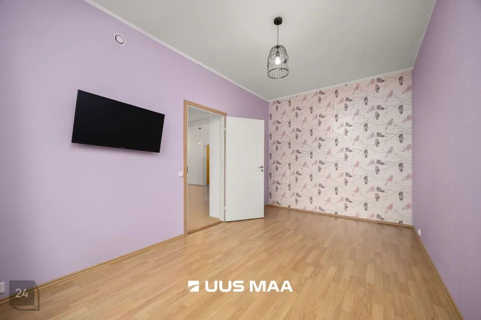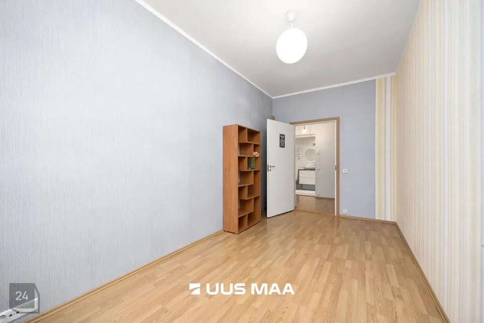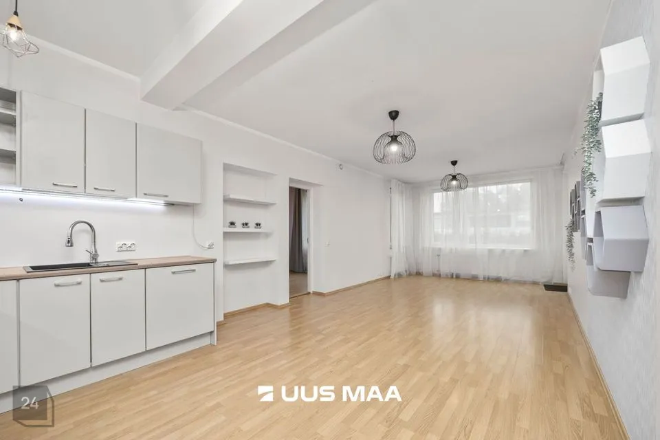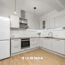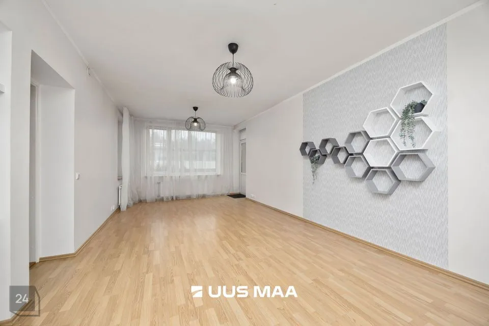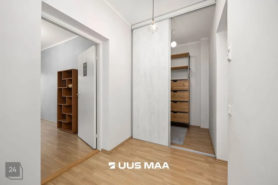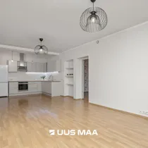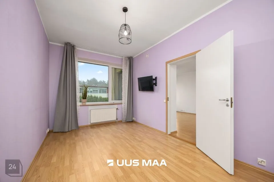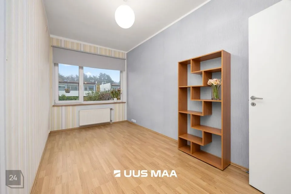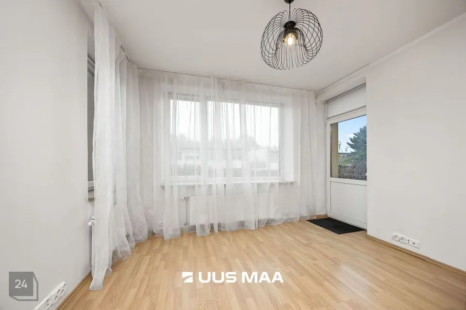 For sale: a bright and well-designed three-room apartment in the heart of Luige, surrounded by greenery and offering a peaceful and private living environment. The apartment features two bedrooms, one of which is currently used as a home office. The main bedroom has direct access to a spacious living room, which opens onto a cozy terrace.