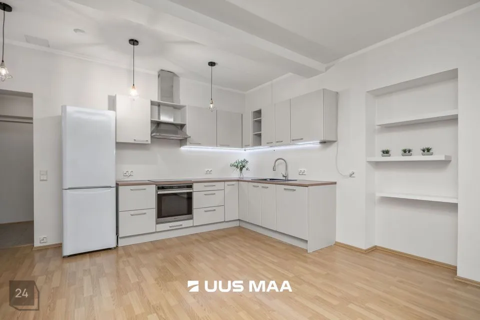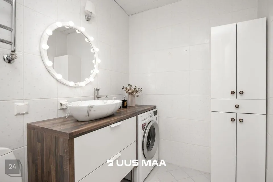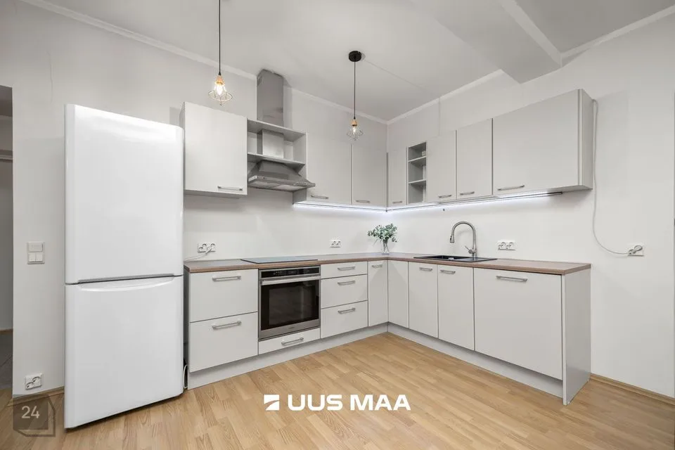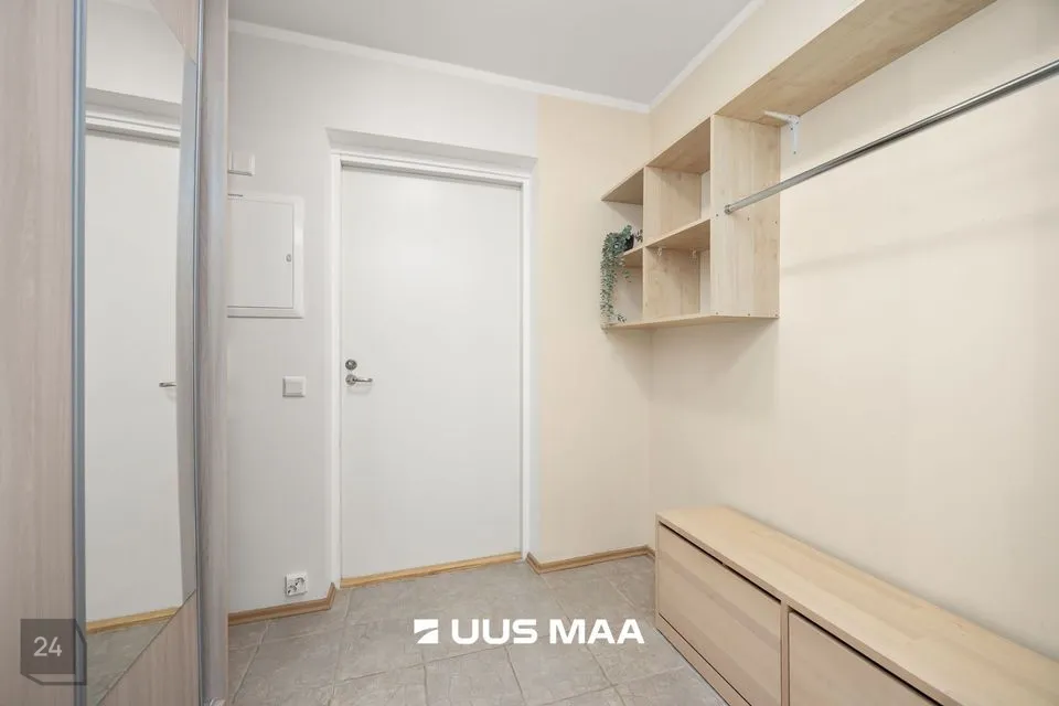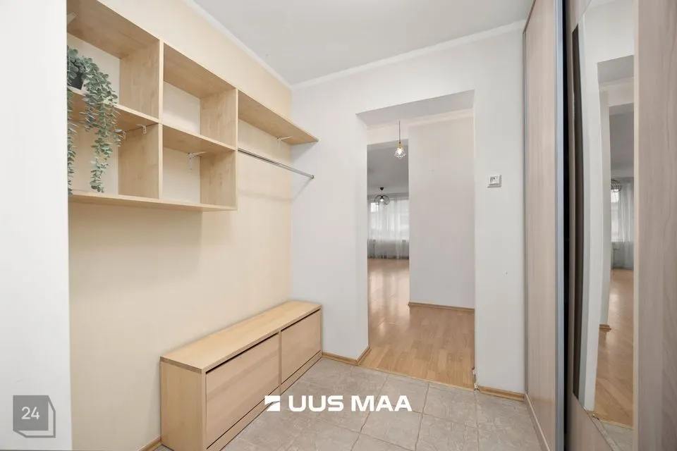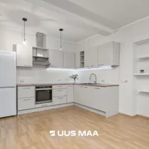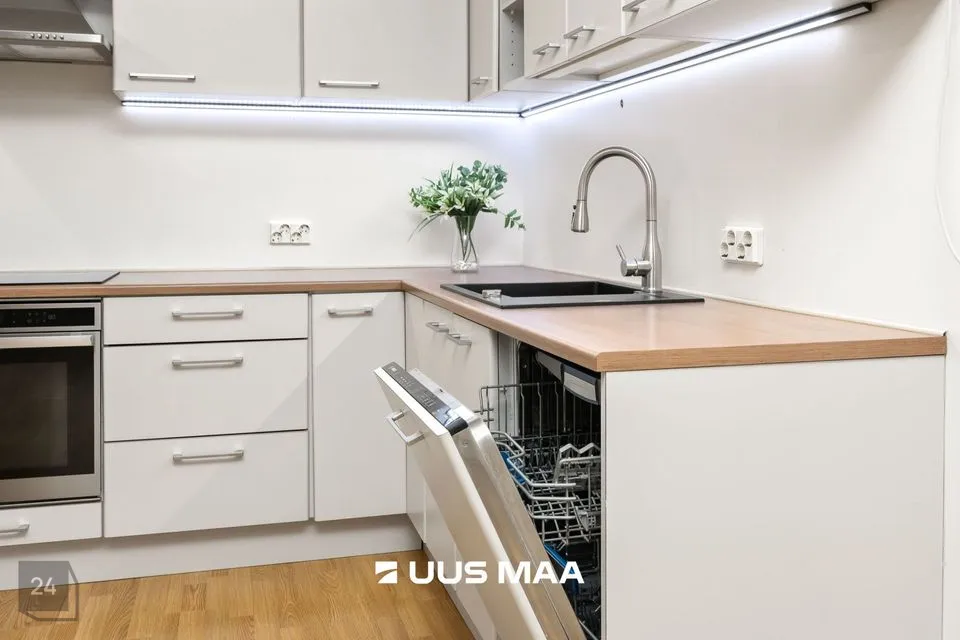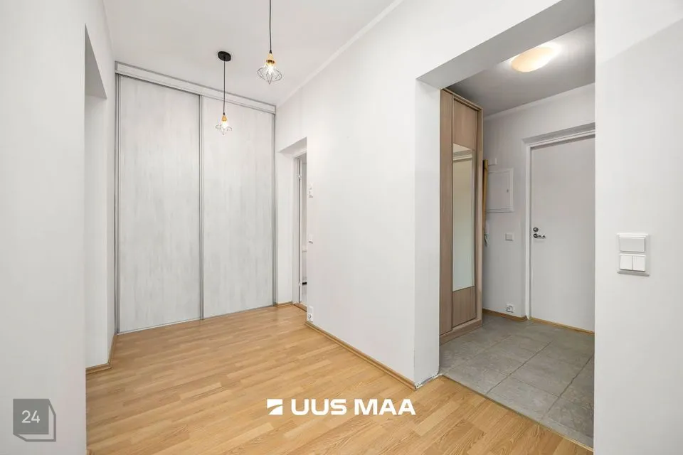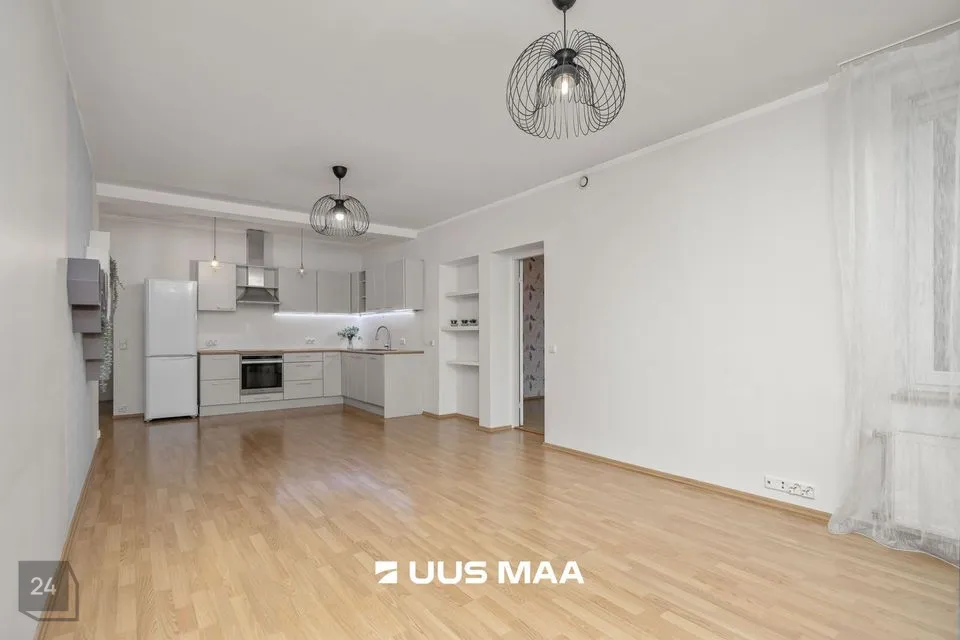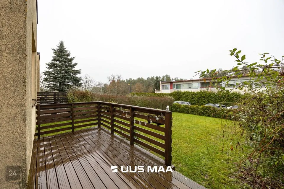 For sale: a bright and well-designed three-room apartment in the heart of Luige, surrounded by greenery and offering a peaceful and private living environment. The apartment features two bedrooms, one of which is currently used as a home office. The main bedroom has direct access to a spacious living room, which opens onto a cozy terrace.