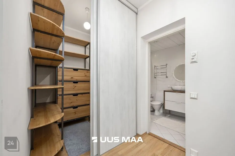 The apartment offers smart storage solutions throughout. The hallway includes a custom-made mirror wardrobe and shelves. Additionally, there is a separate walk-in closet designed to accommodate clothing, suitcases, and seasonal items.