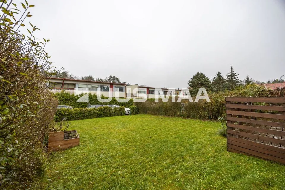 The apartment includes a privately owned garden area of 158 m² (registered by notarial right), fenced and bordered with rapidly growing thuja trees, ensuring privacy. The garden is carefully maintained with a lush lawn, a raised planter suitable for flowers, herbs, or vegetables, and an outdoor storage box for gardening tools.