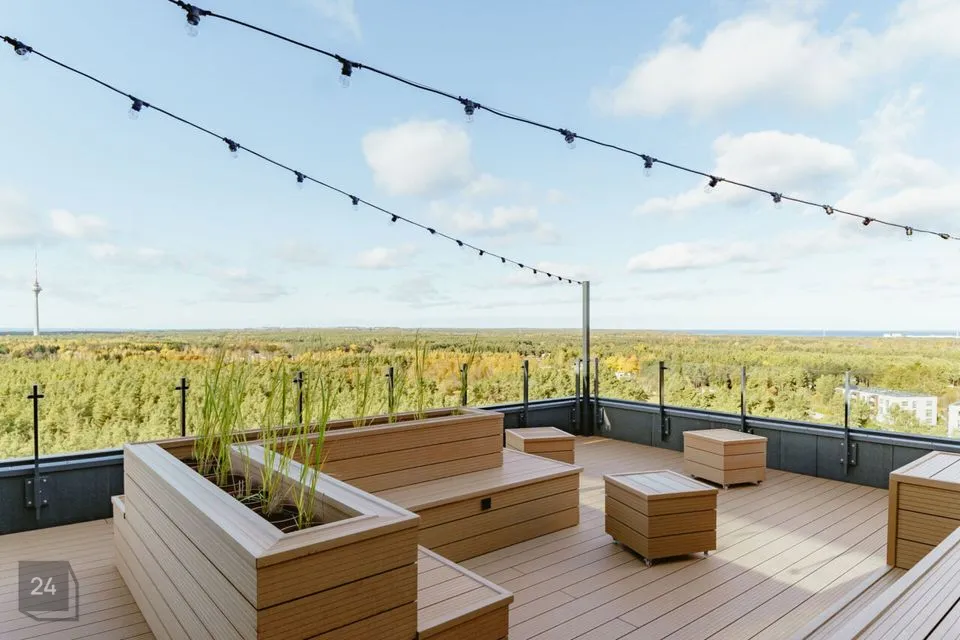 ADDED VALUES - Spacious lobby and CoWorking area with access to an outdoor terrace - Outdoor grill and relaxation area in the yard - Private gym for residents - Closed and secure bicycle parking for up to 40 bicycles - Rooftop terrace with views of forest areas and sea border - Personal parking spaces - Personal parking spaces with electric car charging station readiness - Personal storage spaces - Electric car charging service - Keyless apartment opening readiness