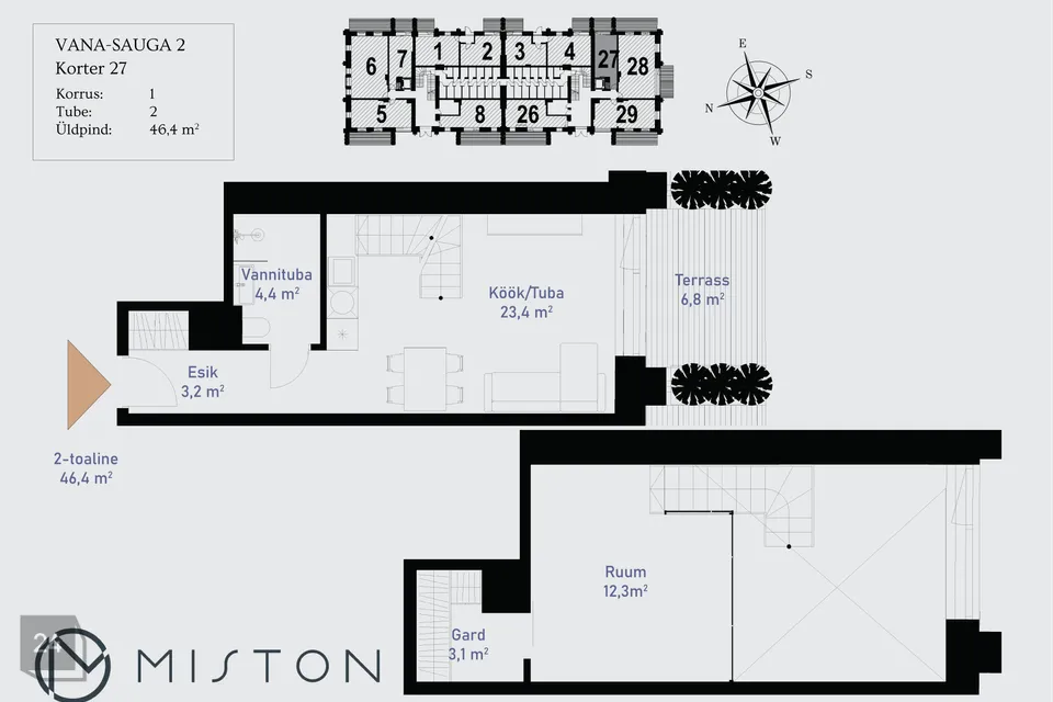 Vana-Sauga 2-29 on hea planeeringuga 2-toaline loft tüüpi korter, mis asub kortermaja 1. korrusel. Korter on läbi kahe korruse, koosneb avatud kööginurgaga toast, magamistoast, 2 vannitoast, millest ühes on saun, esikust, 3 garderoobist ning pool korrusel asuvast 1 ruumist. Terrass (15,7 m²) on avatud õhtupäikese poole.