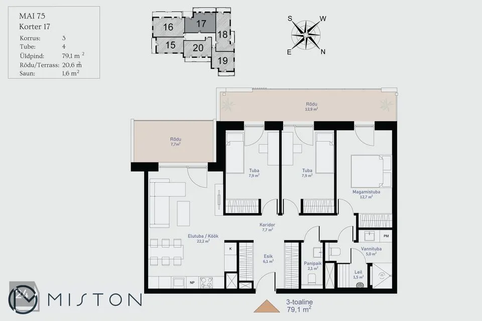 Mai 75-17 on hea planeeringuga 4-toaline korter, mis asub kortermaja 3. korrusel. Eluruumid koosnevad avatud köök-elutoast, kolmest magamistoast, saunaga vannitoast, wc ja esikust. Korteri maast-laeni aknad on avatud päevapäikese poole. Korteril on kaks valgusküllast rõdu (7,7 m²) ja (12,9 m²), kuhu pääseb kõikidest tubadest. Maja elektri- ja kütte arveid aitab kontrolli all hoida Bisly nutikodu lahendus.