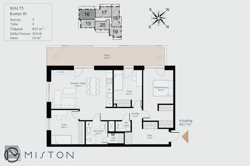Mai 75-16 on hea planeeringuga 4-toaline korter, mis asub kortermaja 3. korrusel. Eluruumid koosnevad avatud köök-elutoast, kolmest magamistoast, saunaga vannitoast, wc ja esikust. Korteri maast-laeni aknad ja valgusküllane rõdu (21.9 m²) on avatud õhtu- ja päevapäikese poole.