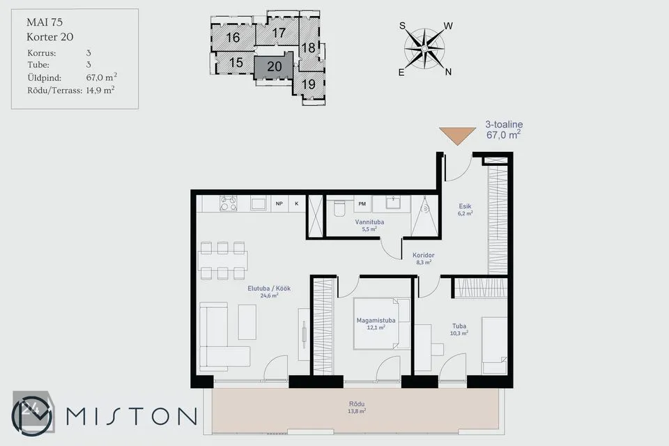Mai 75-20 on hea planeeringuga 3-toaline korter, mis asub kortermaja 3. korrusel. Eluruumid koosnevad avatud köök-elutoast, kahest magamistoast, vannitoast ja esikust. Korteri maast-laeni aknad ja avar rõdu (14,9 m²) on avatud hommikupäikese poole. Maja elektri- ja kütte arveid aitab kontrolli all hoida Bisly nutikodu lahendus.