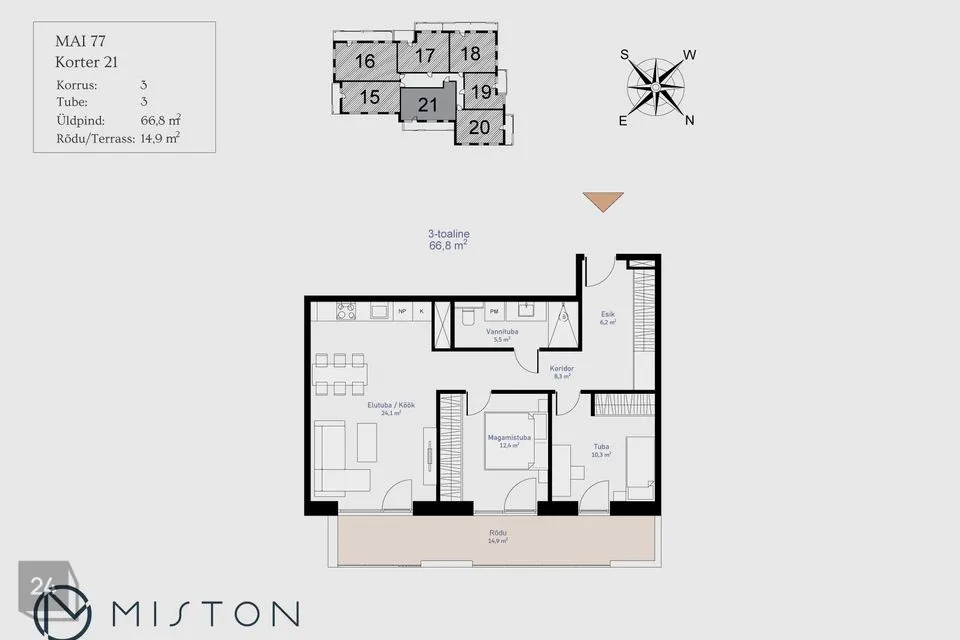 Mai 77-21 on hea planeeringuga 3-toaline korter, mis asub kortermaja 3. korrusel. Eluruumid koosnevad avatud köök-elutoast, kahest magamistoast, vannitoast ja esikust. Korteri maast-laeni aknad ja avar rõdu (14,9 m²) on avatud hommikupäikese poole.
