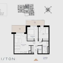 Mai 77-10 is a well-designed 3-room apartment located on the 2nd floor of the building. The apartment consists of an open-plan kitchen and living room, two bedrooms, a bathroom, a storage room, and an entrance hall. Floor-to-ceiling windows open to the daytime and evening sun. The apartment has two bright balconies (7.7 m² and 7.8 m²), accessible from the living room and bedroom.