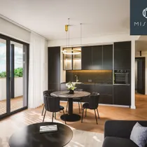 High-quality and durable materials are used in the interior finishing of all apartments. Buyers can choose from three interior design styles. Spaciousness is enhanced by high ceilings and triple-glazed, energy-efficient floor-to-ceiling PVC windows. The living area floors are covered with natural solid wood parquet. The sanitary rooms are equipped with high-quality sanitary ware. The apartments include water-based underfloor heating, heat-recovery ventilation, and cooling readiness.