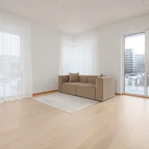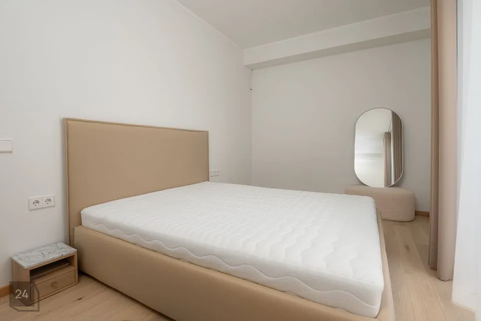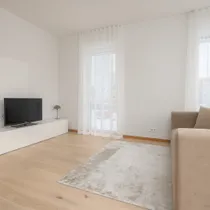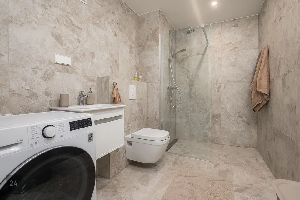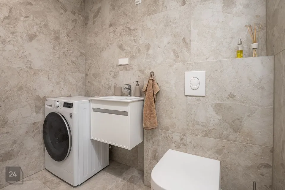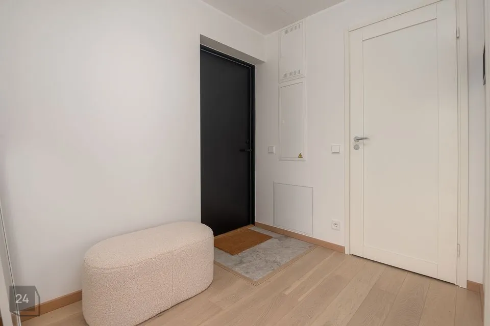 High-quality and durable materials are used in the apartment’s interior finishes. Spaciousness is enhanced by high ceilings and triple-glazed energy-efficient PVC windows. The floors are covered with natural solid wood parquet, and the bathroom features premium sanitary fittings with porcelain-finished ceramic tiles in a stone pattern. The apartment has water-based underfloor heating, a heat recovery ventilation system, and cooling readiness.