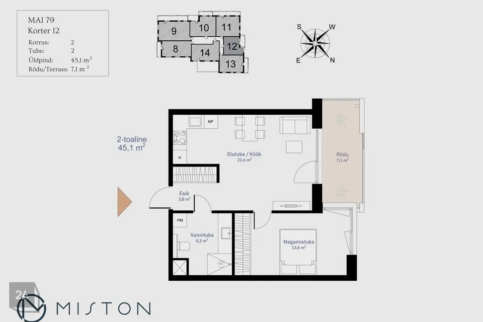 Mai 79-12 on hea planeeringuga 2-toaline korter, mis asub kortermaja 2. korrusel. Korteris on avatud köök-elutuba, magamistuba, esik ning vannituba. Korteri maast-laeni aknad on avatud õhtupäikese poole.