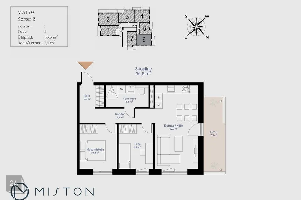 Mai 79-6 on hea planeeringuga 3-toaline korter, mis asub kortermaja 1. korrusel. Korteris on avatud köök-elutuba, 2 magamistuba, esik ning vannituba. Korteri maast-laeni aknad on avatud hommiku- ja õhtupäikese poole.