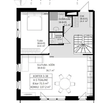 Astangu 50B/3-38 is a 137.2m2 penthouse apartment, which includes a 12.2m2 balcony and a 91.5m2 terrace. The apartment's discounted price is €499,300.