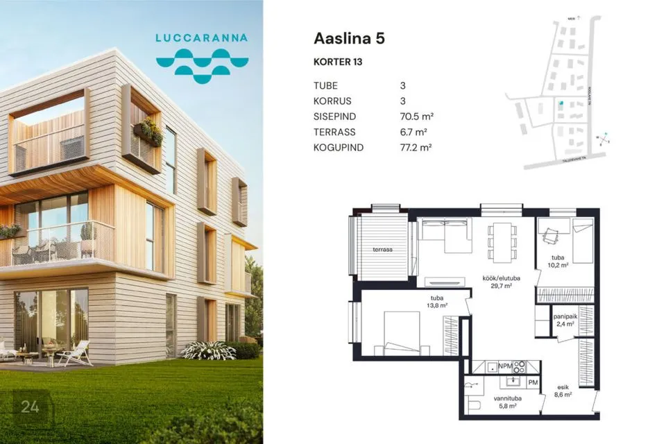 Luccaranna is located in Tallinn, in the seaside part of the Tiskre district next to Tabasalu Bank. It was a popular summer resort for the finer people in the 19th century. The Luccaranna residential area consists of 20 apartment buildings and 11 triple villas - a total of 254 new homes will be built in this seaside residential area. Luccaranna's distinctive strength is the comprehensive solution created by KUU architects and Kino landscape architects – a linear park running through the center of the residential area with walking paths that connect the homes with natural vegetation areas and the beach.
