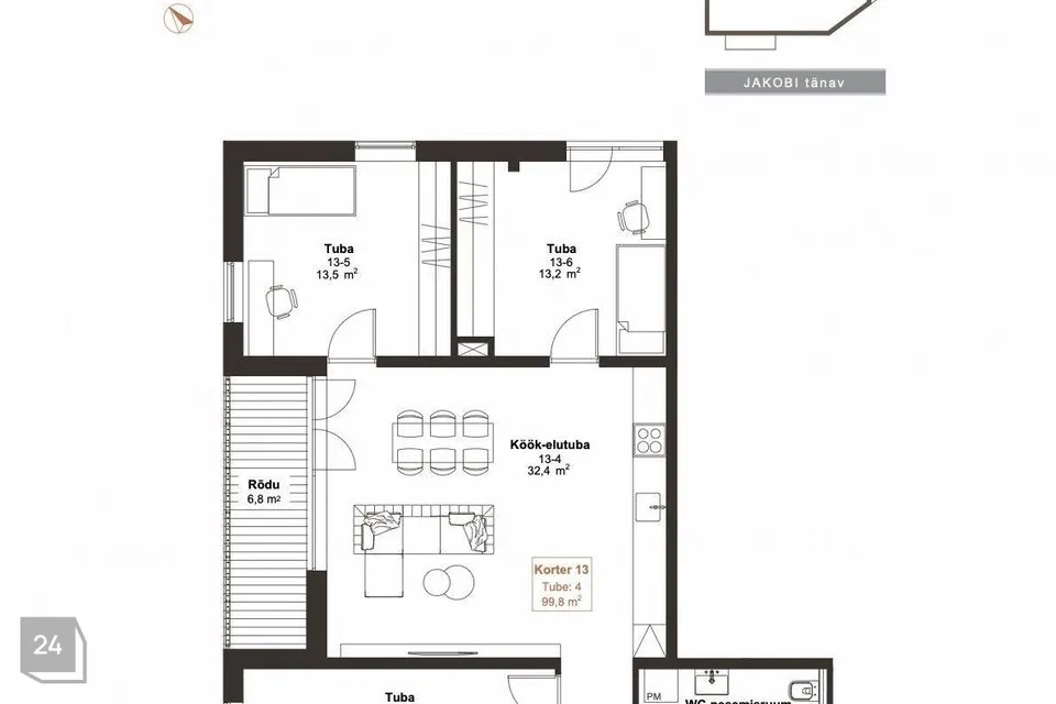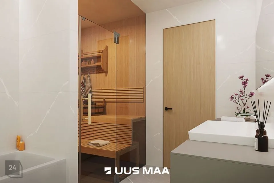 We offer a 99.8 m² apartment with a sauna and balcony on the fourth floor of the building. The apartment features a spacious kitchen-living room, three bedrooms, one of which has a walk-in closet. There is a bathroom with a shower, bathtub, and sauna, as well as a separate guest toilet. The apartment also has a cozy 6.8 m² covered balcony and an especially spacious 13 m² hallway.