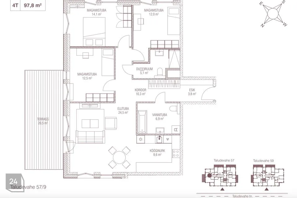 Tiskre Prisma, within walking distance, can become your home store, and numerous surrounding eateries provide a break from daily cooking. Tabasalu is located uphill, offering diverse shopping, sports, and leisure opportunities. Tiskre Basic School is set to be completed next year.