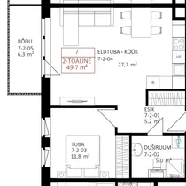 The Astangu 50B/2- 7 apartment is a 2-room apartment with a 6.3m2 balcony. The views open onto the courtyard, west direction. Shower room.