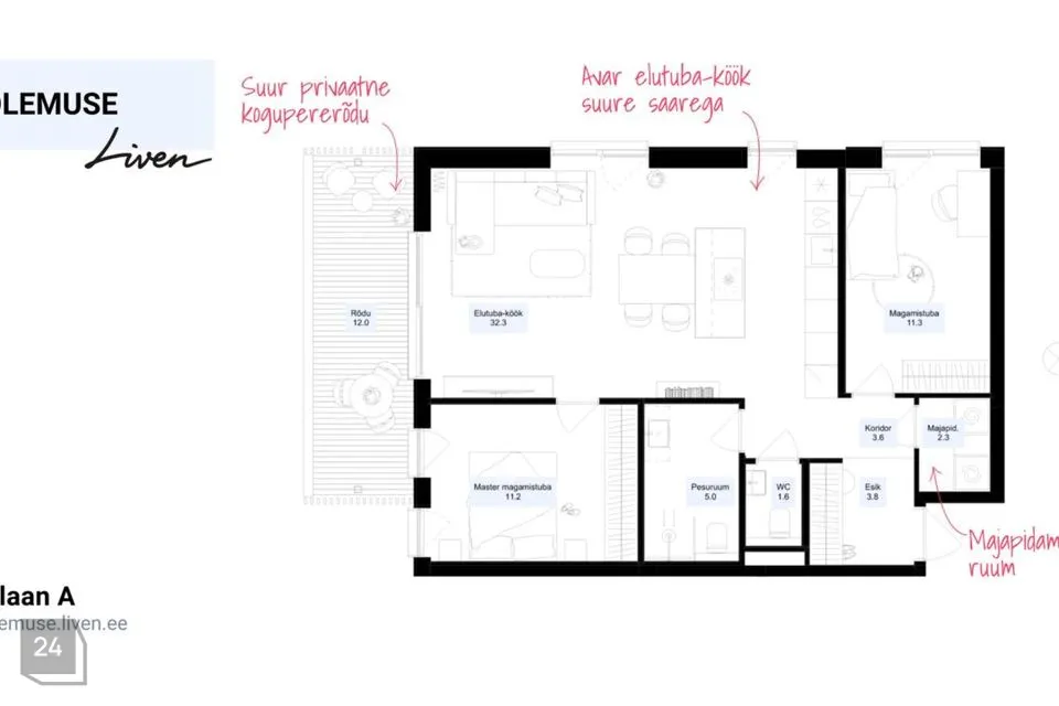 All 12 Olemus houses are small, with homes ranging from 3 to 5 rooms, with layouts carefully thought through. Each home has its private balcony or terrace with southern or evening sun exposure. The houses have A-energy class, solar panels, and ground-source heating.