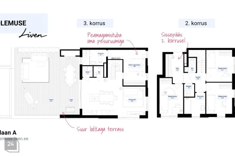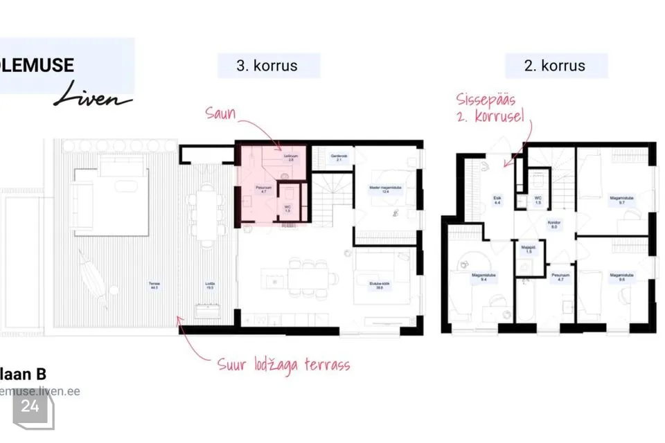 This 5-room home is very spacious and bright – the layout spans two floors, and the ceilings on the top floor are an impressive 3 m high. The kitchen offers a kitchen island and pantry option, the main bedroom has a walk-in closet or laundry room, whichever you prefer. Additionally, there's a separate utility room and an exceptionally large sun-facing terrace where you can enjoy the peace and beauty of Nõmme with your entire family. Or would you prefer a sauna?