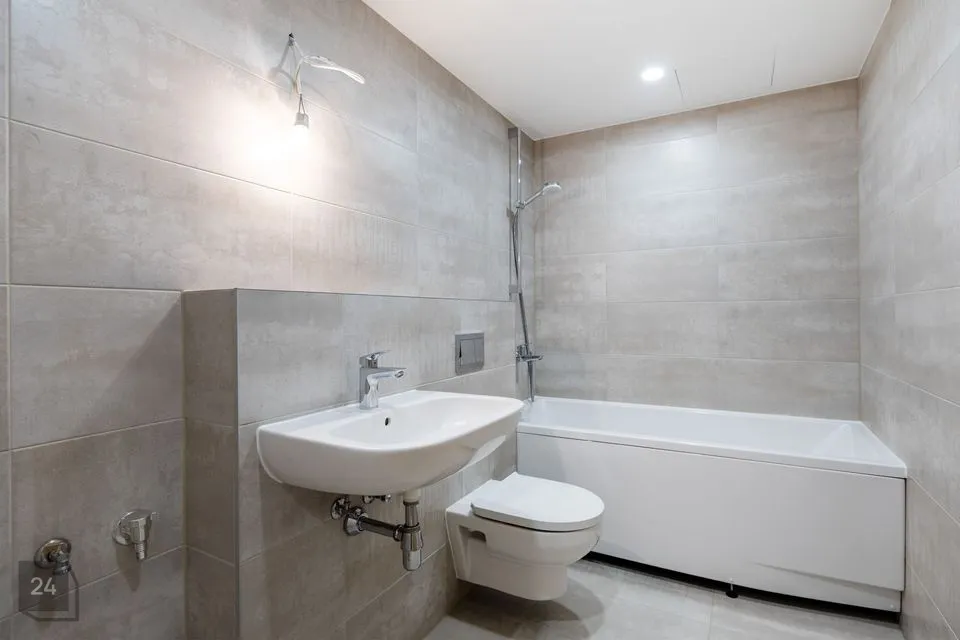 The apartment features high-quality finishes: natural parquet flooring, a bathroom tiled in elegant gray tones, and wooden veneer doors.