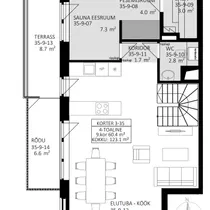 Astangu 50B/3-35 is a 123.1 m2 penthouse apartment, which comes with 2 balconies (6.7m2+6.6m2) and a terrace (8.7m2), offering magnificent views towards the forests and Harku Lake.