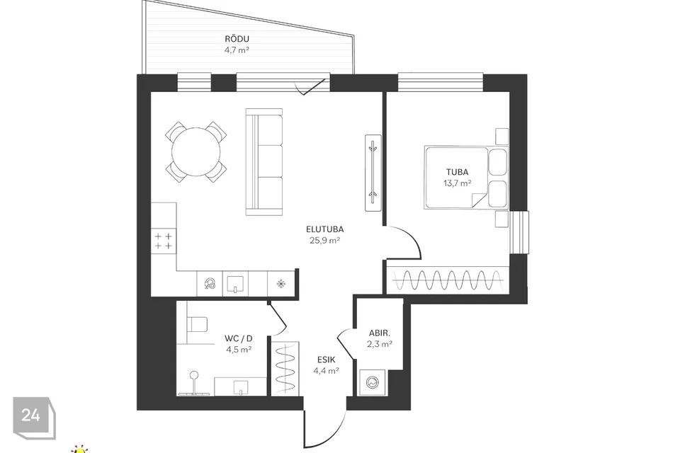 This is an energy-efficient B-class apartment building. Room-based regulated water floor heating, heat recovery ventilation, and cooling devices in penthouse apartments ensure a good indoor climate. A modern Smart Home system makes everyday life more convenient and energy-efficient.
