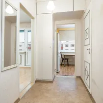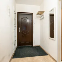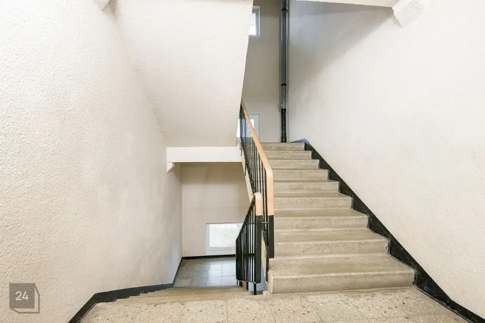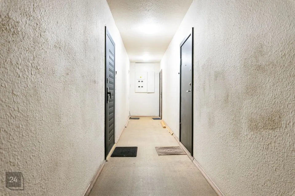 A large entryway shared among three apartments. The apartment has an entryway with a storage area of approximately 2m2, to the right is the bathroom/toilet, directly ahead is the kitchen, and to the left is a large living room/bedroom with a balcony. The balcony is glazed.