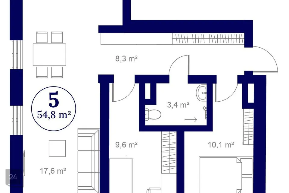 The apartment consists of an entrance hall, a living room with an open kitchen, two bedrooms, and a shower-toilet room - with a total area of 54.8 m2.