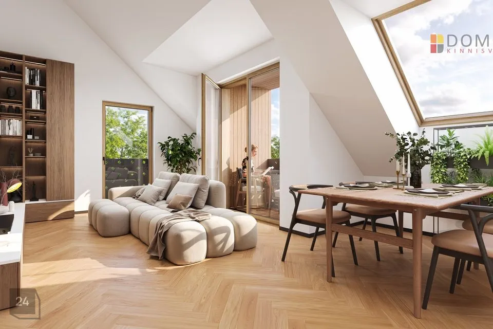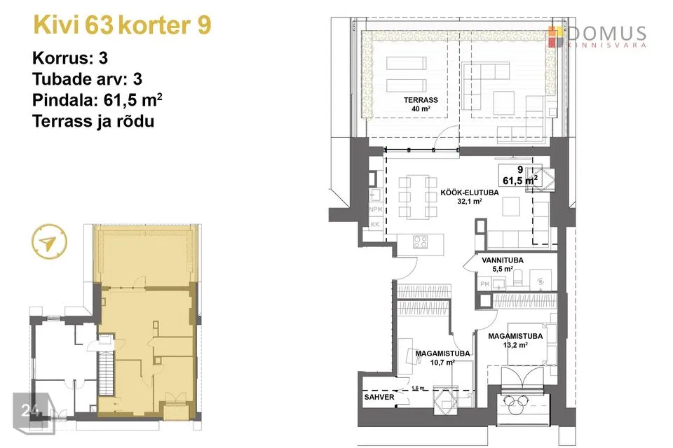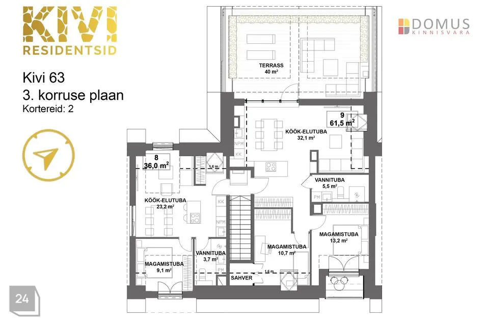 This spacious 3-room, 61.5 m² apartment is located on the third floor of the new development and is an ideal home for those who value privacy and space. The heart of the apartment is the 32.1 m² open-plan kitchen-living room, which opens up to an impressive 40 m² terrace – a true extension of your living area during the summer months. In addition, the apartment also features a private balcony.