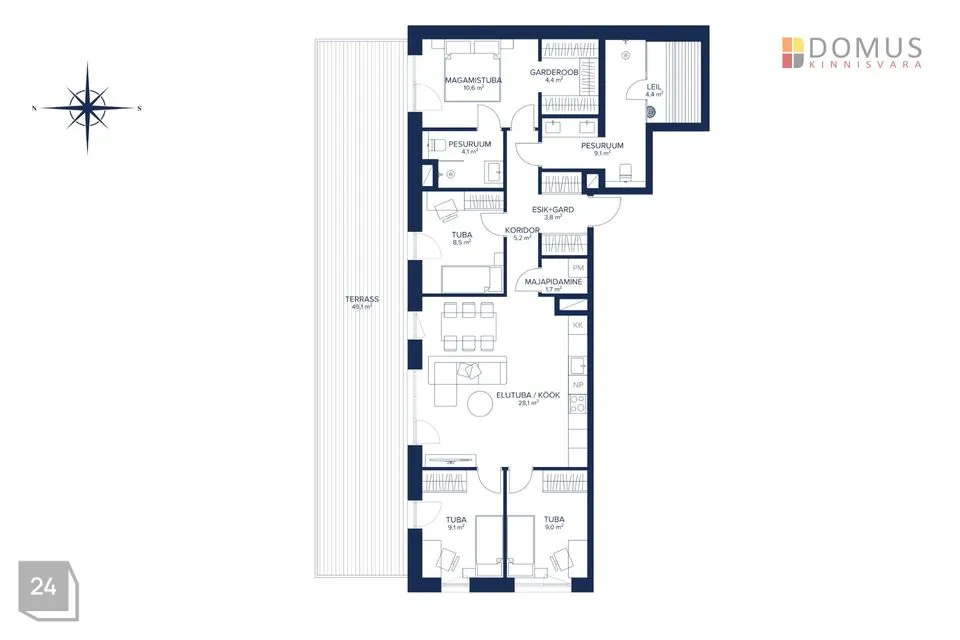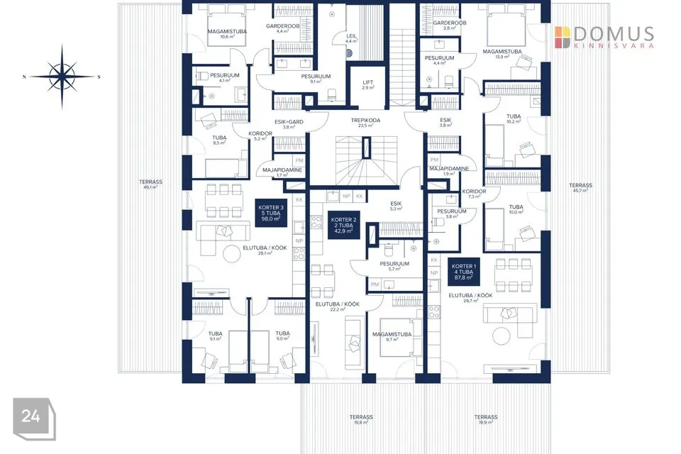 The apartment has a spacious entrance hall with two wardrobes (3.8 m²), a corridor (5.2 m²), a living room with an open kitchen (28.1 m²), which leads to a spacious, 49.1 m² terrace.