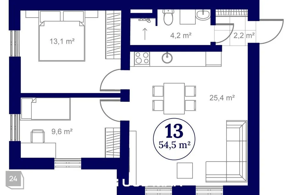 The apartment is located on the 1st floor, with views from the windows facing the front of the house and one side. The apartment consists of an entrance hall, a living room with an open kitchen, two bedrooms, and a shower-toilet room - with a total area of 54.5 m2.