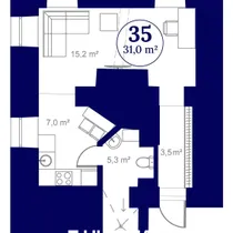 The apartment is located on the building's basement floor, with views from the windows overlooking the back of the house and one side. The apartment consists of an entrance hall, a room with an open kitchen, a living room, and a shower-toilet room - with a total area of 31 m2.