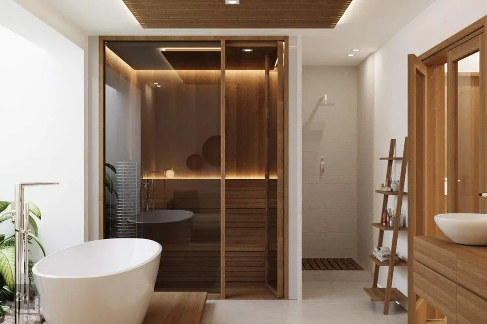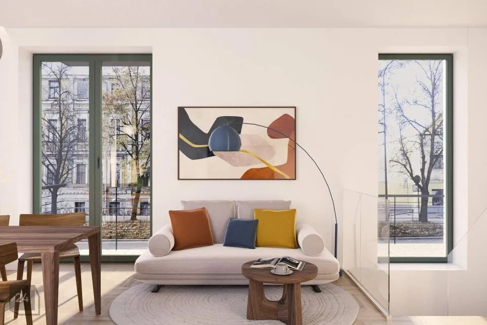 The apartment for sale is designed across two floors - on the first floor there is an entryway, an open-plan kitchen-living room, two bedrooms, and a shower-toilet room, and in the basement floor there is a so-called home spa - a private relaxation and sauna complex with auxiliary rooms - with a total area of 86.7 m²