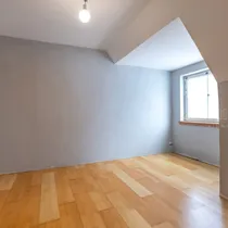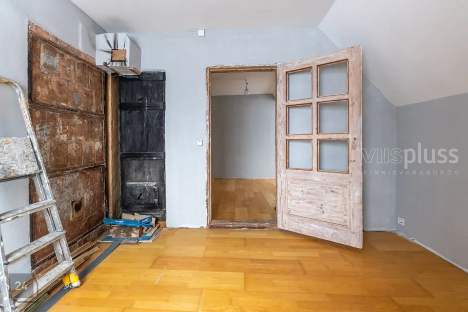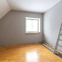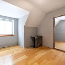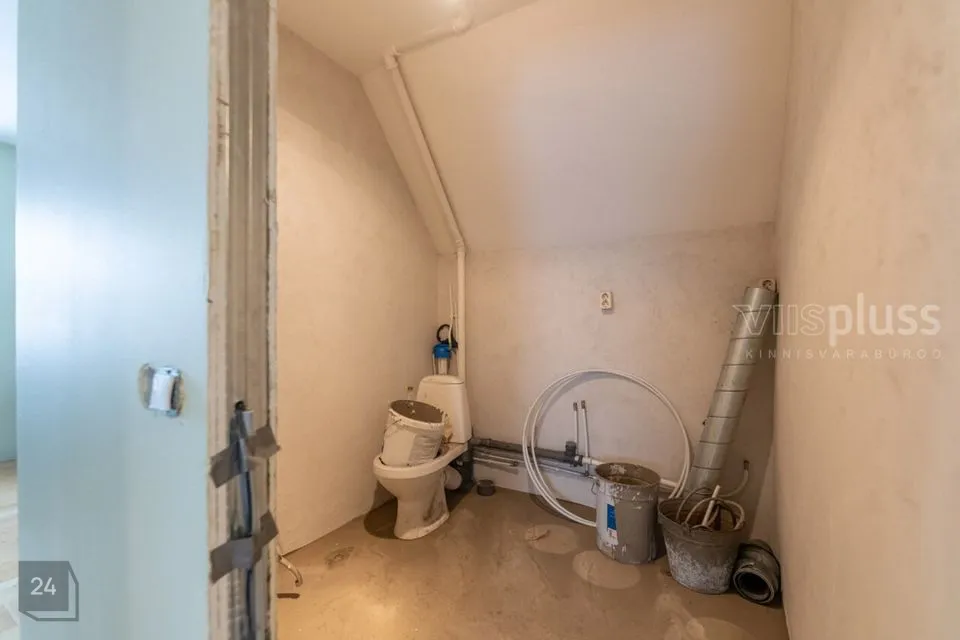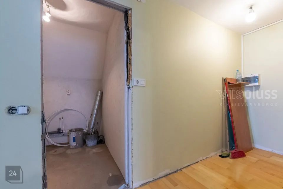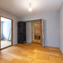 Renovation work has been started in the apartment, with insulation installed, new windows, electricity, and internal plumbing. The bathroom has a new floor with underfloor heating, new partition walls, and finished surfaces.