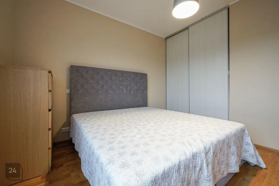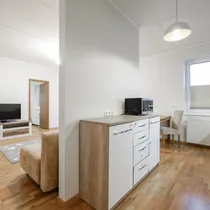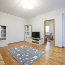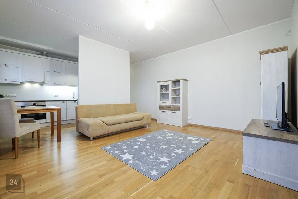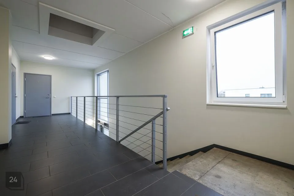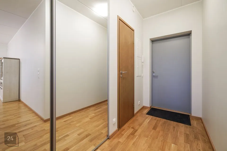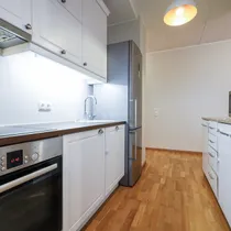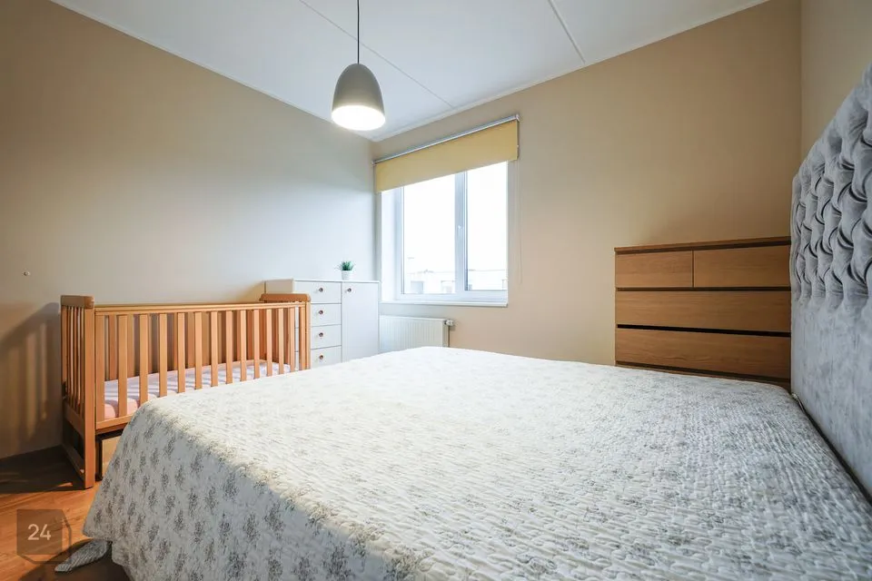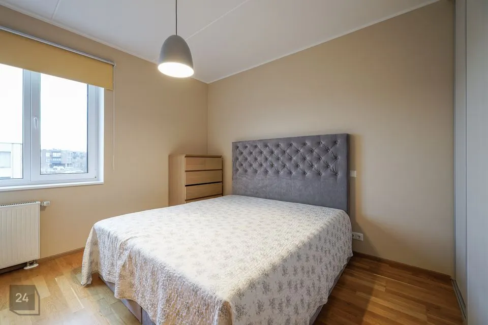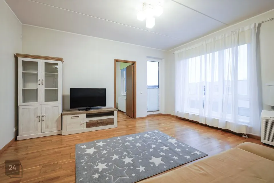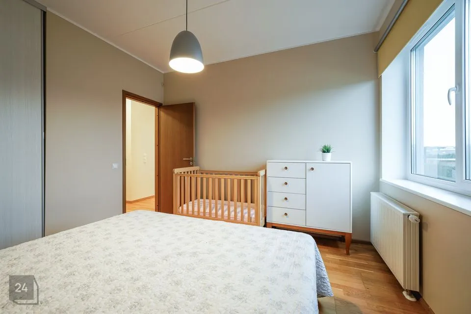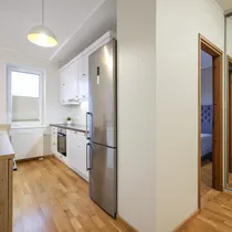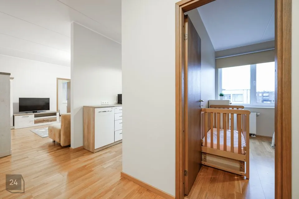 The apartment has a well-designed layout: two bedrooms (one with a spacious built-in wardrobe), a bright open-plan kitchen-living area with access to a loggia-type balcony, an entrance hall with a large wardrobe and a modern bathroom. The kitchen is partially separated from the living room by a light partition, giving it its own space. The bathroom features underfloor heating that can be used year-round. The 4.3 m² loggia is ideal for a small relaxation corner.