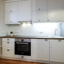 The apartment is fully furnished and equipped. The kitchen includes a fridge, stove, extractor hood, oven, microwave, capsule coffee machine, toaster and kettle. The bathroom has a washing machine. The living room has a TV. Both bedrooms and the living room are furnished.
