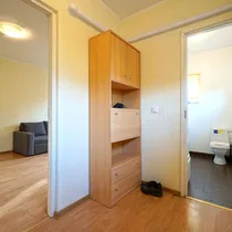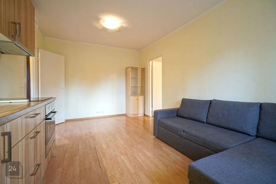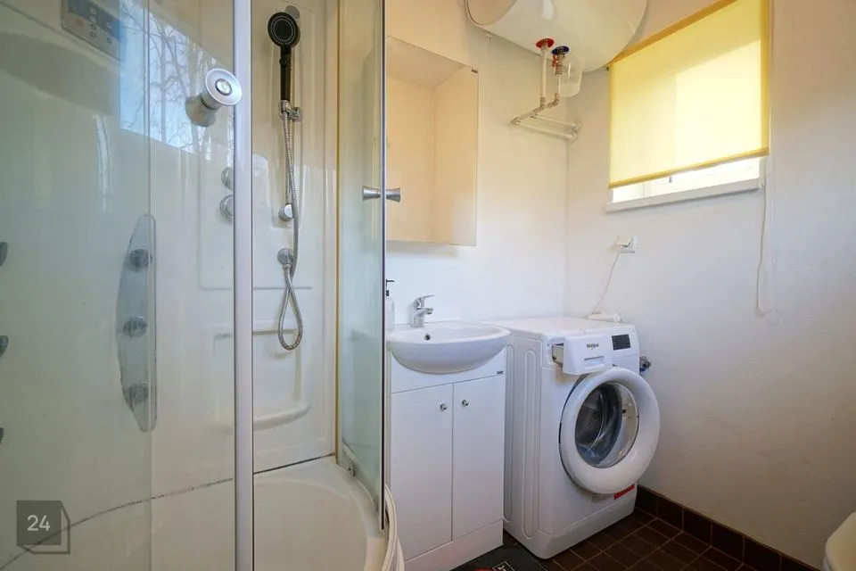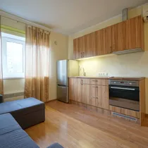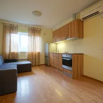 • Finishing: Floors have laminate parquet and walls are painted in light tones. • Kitchen: Open kitchen with kitchen furniture including integrated appliances: ceramic stove, oven, range hood, and refrigerator. • Bathroom: Joint WC/bathroom is equipped with a shower, hot water boiler, and washing machine.